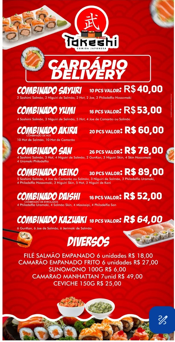 Each dish, whether a classic or a fusion creation, reflects the restaurant's commitment to providing a unique and high-quality dining experience. With its diverse menu, Takeshi Comida Japonesa offers something for everyone, making it an ideal spot for those craving authentic and inventive Japanese cuisine.